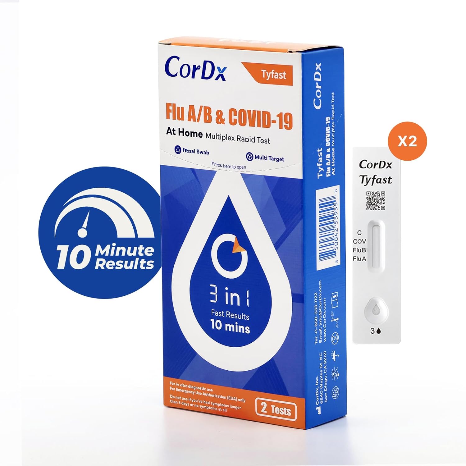 CorDx Tyfast COVID-19/Flu A&B Rapid Self-Test (2 Tests / Kit) Case of 90 Kits